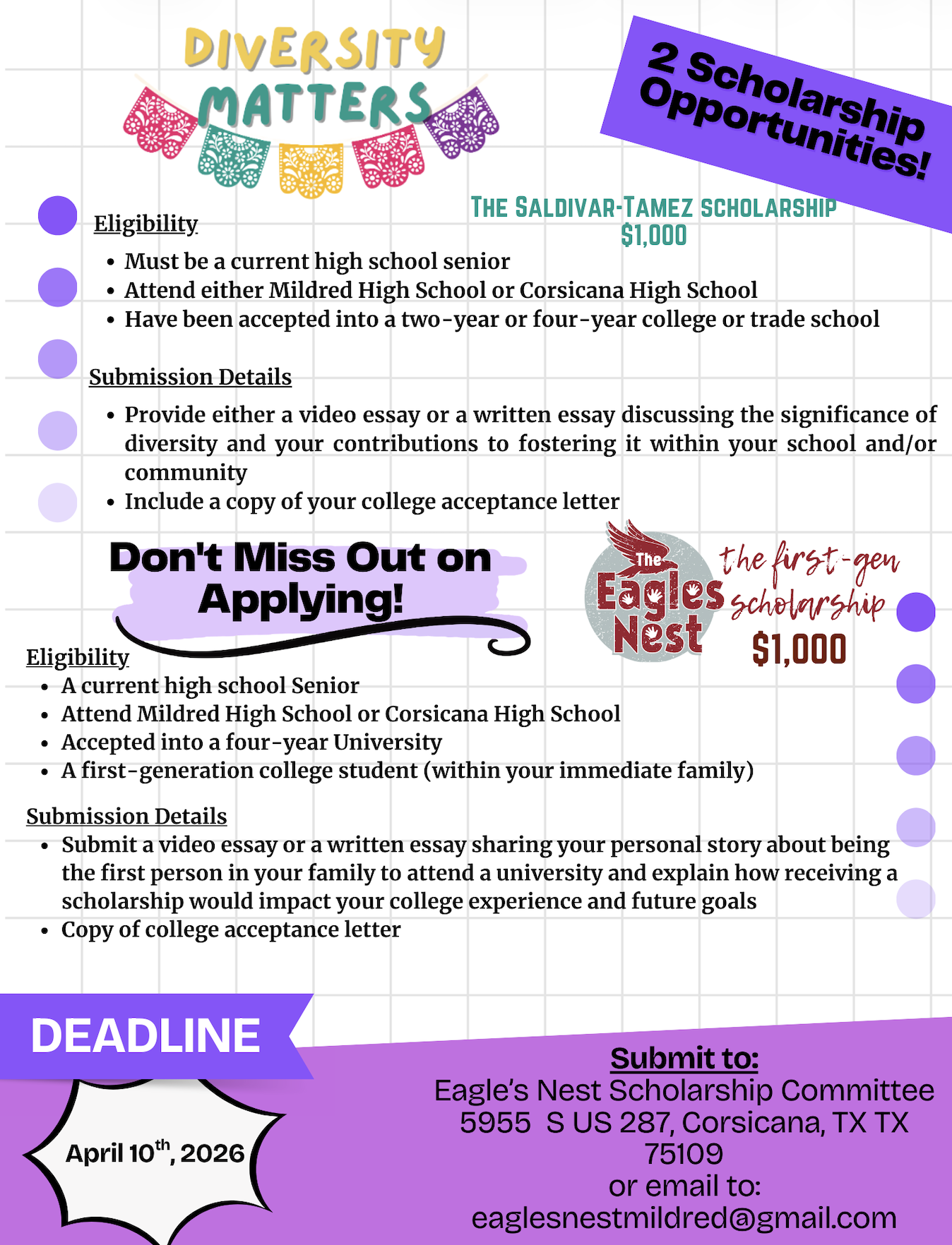 Poster displaying scholarship opportunities for the class of 2024. The left side highlights diversity matters and features Elise Atkeisson and Gabriel Irvine, with a colorful decorations at the top. The right side advertises first-generation scholarship opportunities, showing Shelby Beldin, Kami Owen, and Jose Garcia, with a logo of Eagle's Nest Play to Learn Center.